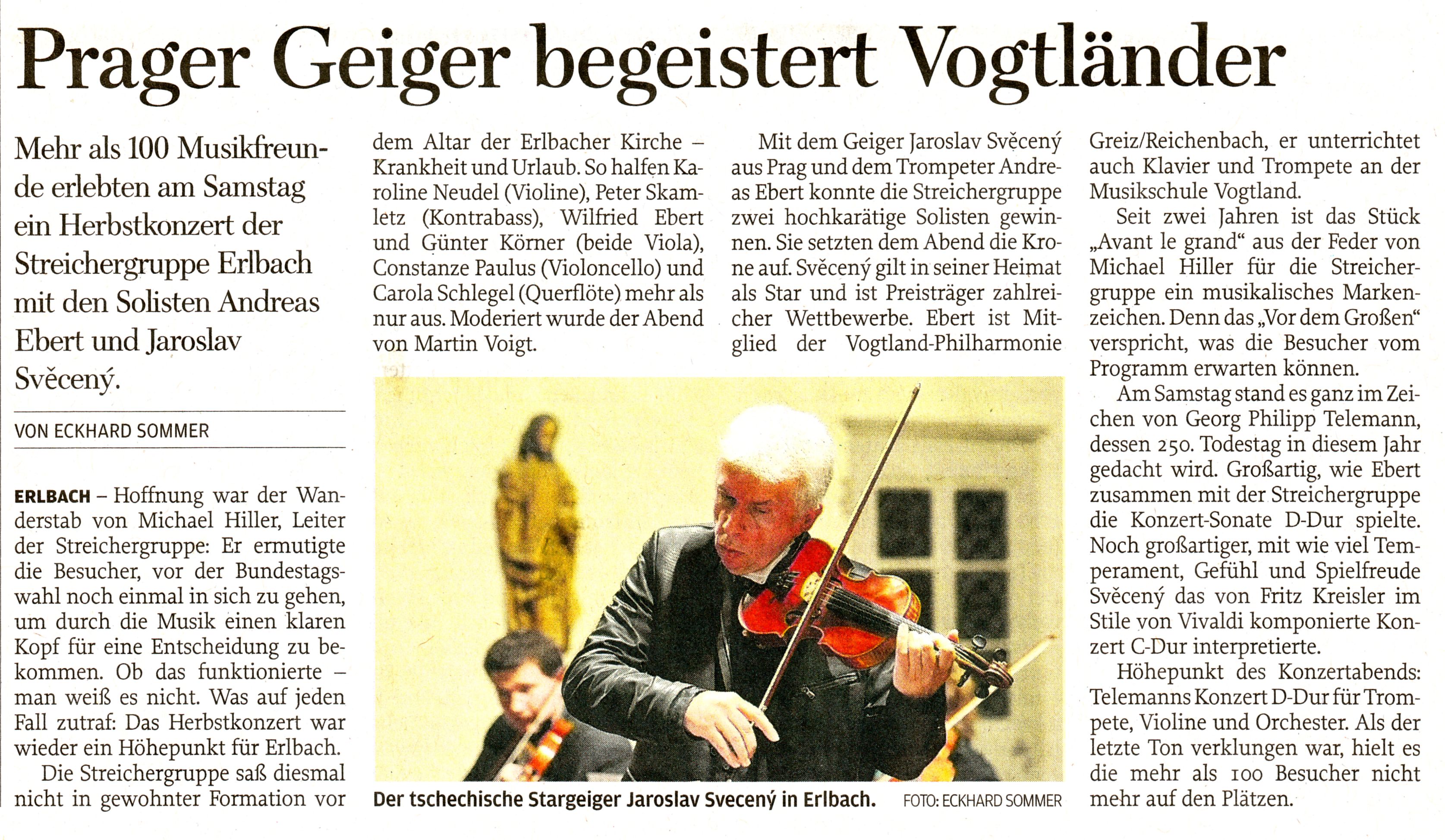 Sa., 23.09.2017 19.30 Uhr Kirche Erlbach | Herbstkonzert mit Jaroslav Svěcený (Violine - Praha/Prag, CZ) Andreas Ebert (Trompete - Falkenstein) mit freundlicher Unterstützung der ![]() | |