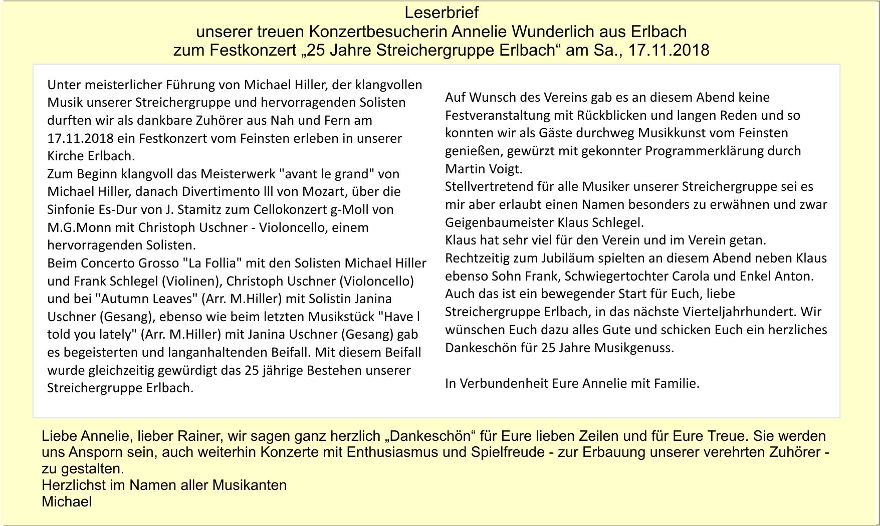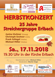 Sa., 17.11.2018 19.30 Uhr Kirche | Herbstkonzert "25 Jahre Streichergruppe Erlbach" mit Janina Uschner - Gesang Christoph Uschner - Violoncello Frank Schlegel - Violine Michael Hiller - Violine | ______________________ |