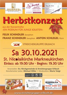 Sa., 30.10.2021 19.30 Uhr Nikolai-Kirche Markneukirchen | Herbstkonzert der Konzertreihe "Ein Podium für junge Solisten" mit Felix Schindler und Franz Schindler (Saxophone) und Anton Schlegel (Horn) Einlass: 19.00 Uhr Es gelten die 3G-Zugangsregeln: getestet - genesen - geimpft | ![]() |